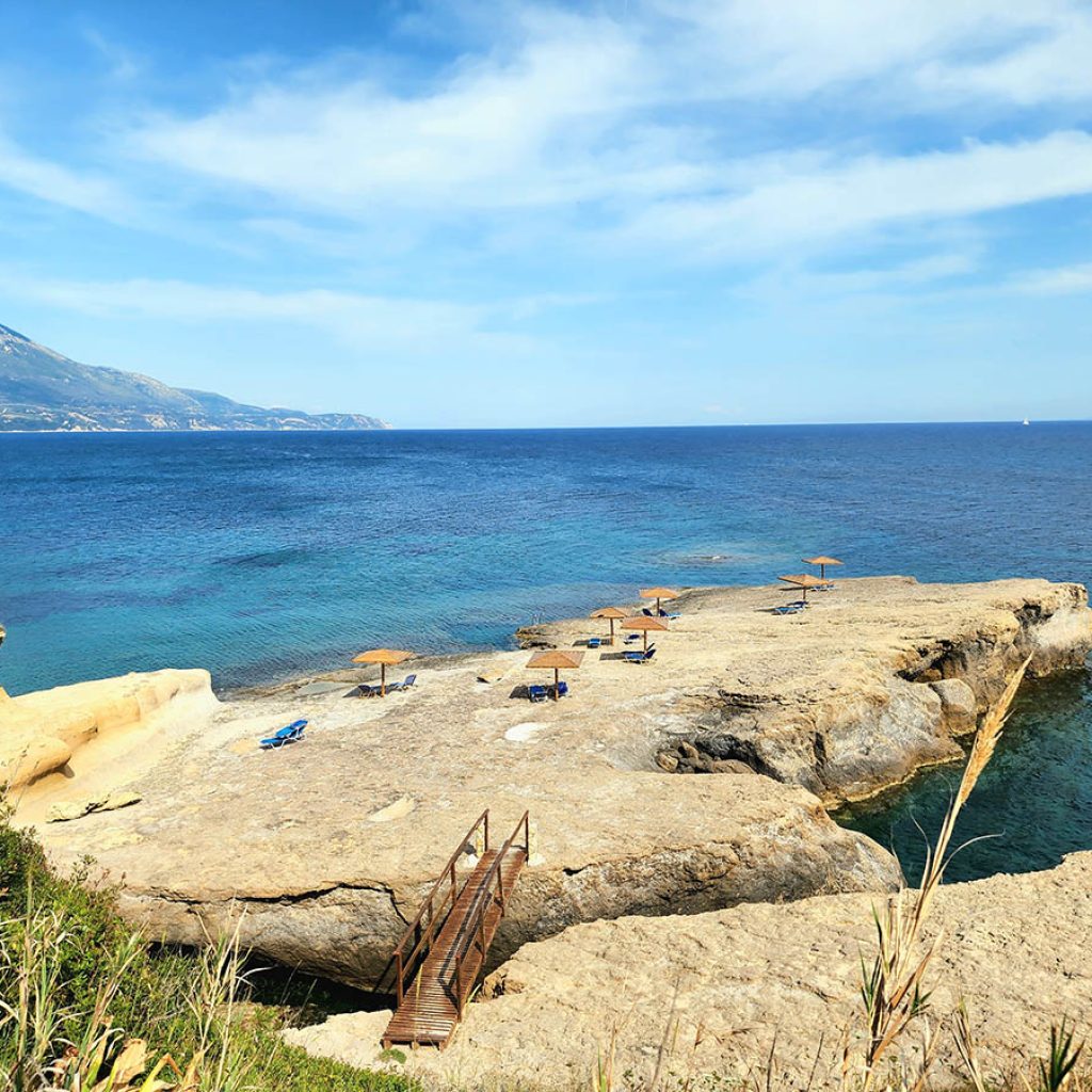 Para los que prefieran playas más implementadas, con restaurantes, toldillas y servicio directo a la tumbona mi recomendación es Antisami (anti se usa para significar en contra de o al otro lado de). Antisami está al otro lado del monte que sirve de protección natural del puerto de Sami en una bahía menor. A unos 30 kilómetros de Argostoli atravesando de costa a costa el macizo central por una nueva carretera llegaréis a Sami que deberéis cruzar por su cintura para subir el monte que separa ambas bahías y al bajar llegaréis a esta playa de cantos rodados, de aguas diáfanas y de fondos blancos. Con excelentes bares y restaurantes, cómodas reposeras y algo de música no invasiva. Allí en sus aguas traslucientes y poco profundas con vuestra máscara de buceo podréis maravillaros de los gigantescos cardúmenes de Obladas que transcurren sin premura ni temor entre las piernas de los bañistas confundiéndose con las albas piedras del fondo. Antisami es para mi gusto la mejor playa de Cefalonia para quienes buscan un descanso tradicional, cómodo y relajado, y para quienes se arriesguen a batallar con los dioses y combatir con las quimeras allí seguirá Amandakis poniendo a prueba vuestra capacidad de asombro y vuestra imaginación.