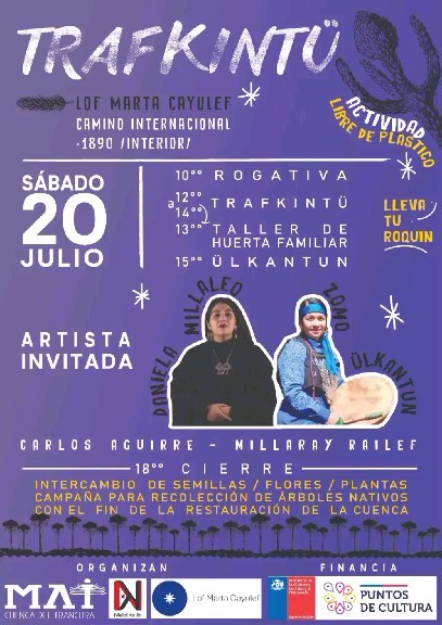 Invitamos a la comunidad de Pucón y alrededores este sábado 20 de julio desde las 10 AM al trafkintu (intercambio de semillas, flores, plantas y árboles) y el ülkantun (canto) el que se realizará en el lof Marta Cayulef (camino internacional 1890 interior).