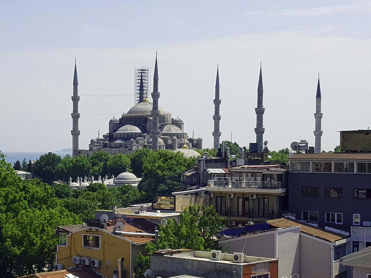 Seguiremos nuestro camino hacia la mezquita azul que se encuentra en línea directa frente a nuestra vista con sus característicos 6 minaretes. Fue construida entre 1609 y 1617 por el arquitecto del Sultán Ahmet I, quien contrario a la tradición otomana también se casó con su favorita, la célebre y omnipoderosa Kösem. El proyecto de la mezquita causó gran escándalo entre los Ulemas ya que igualaba el número de almenares de la gran mezquita al-Haram de la Meca, lo que se consideraba un pecado de orgullo. Ahmet se mantuvo firme con su proyecto ante los Ulemas diciéndoles que ordenaría la construcción de un séptimo minarete en la Meca.
